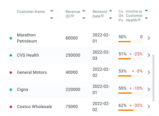 Sort your customers in order of health by clicking the up or down arrow on the involve.ai Customer Health column header.